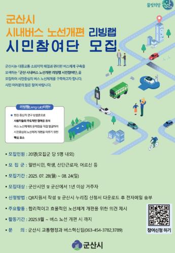[뉴스노크=김인호 기자] 군산시가 시내버스 노선체계 개편을 앞두고 시민이 직접 참여해 문제를 진단하고 개선방안을 도출하는 ‘시내버스 노선개편 리빙랩 시민참여단’을 모집한다.