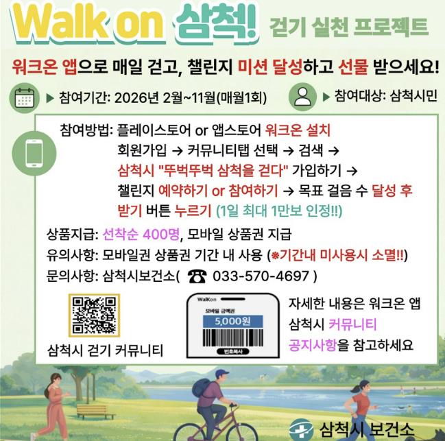 [뉴스노크=김인호 기자] 삼척시는 시민들의 건강 증진과 일상 속 걷기 실천율 향상을 위해 모바일 걷기 앱 '워크온(Walk On)'을 활용한 ‘워크온 걷기 챌린지’를 오는 2월부터 11월까지 운영한다.