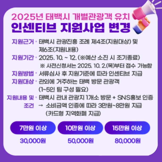 한편, ‘2025년 개별 관광객 인센티브 지원사업’의 세부 지원내용 및 신청조건은 태백시청 문화관광과로 문의하거나, 태백시청 홈페이지 고시/공고 게시판에서 확인할 수 있다.