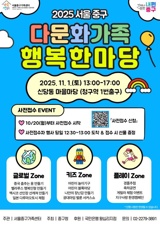 행사는 서울중구가족센터가 주관하는 이번 행사는, 다문화가족과 주민 등 400여 명이 한자리에 모여 서로의 문화를 이해하고 어울리는 소통과 화합의 장으로 꾸며진다.