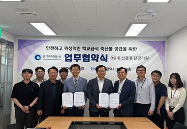 [뉴스노크=김인호 기자] 인천광역시는 성장기 학생들에게 안전하고 우수한 품질의 축산물을 안정적으로 공급하기 위해 2025년도 학교급식 축산물 공급업체 선정을 완료하고, 지난 7월 4일 축산물품질평가원 서울지원(서울지원)과 업무협약을 체결했다고 밝혔다.