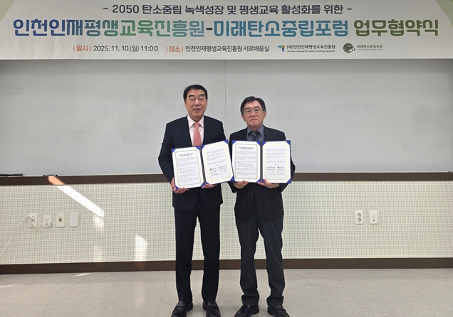 [뉴스노크=김인호 기자] 2025년 11월 10일, 인천인재평생교육진흥원과 미래탄소중립포럼이 탄소중립 시민교육과 평생교육 활성화를 위한 업무협약(MOU)을 체결했다.