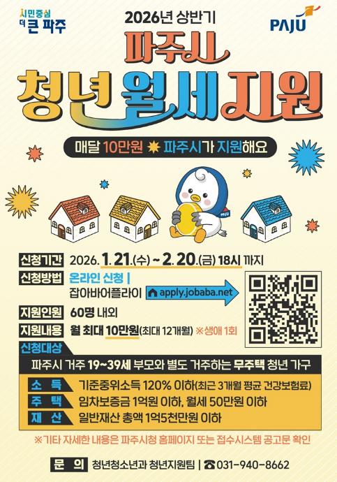 신청 자격은 신청일 기준 파주시 내 주택에 본인 명의로 임대차계약이 체결되어 있고, 파주시에 주민등록을 둔 19~39세(1986년~2007년 출생자) 무주택 청년 가구이다.