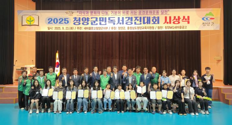 [뉴스노크=김인호 기자] 새마을문고 청양군지부는 지난 23일 청양군 문화체육센터에서 ‘2025 청양군민 독서경진대회 시상식’을 열고, 독서문화 확산에 기여한 학생과 군민들을 격려했다.