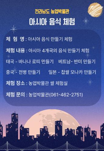 김옥경 전남도농업박물관장은 “이번 다문화 음식 체험은 쌀이라는 공통된 재료를 통해 아시아 여러 나라의 식문화를 자연스럽게 이해하는 소중한 기회”라며 “아이부터 어른까지 모두가 즐기며 배우는 체험이 될 것”이라고 말했다.