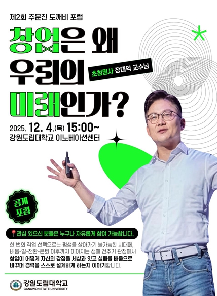 [뉴스노크=김인호 기자] 강원도립대학교는 지역주민과 학생을 위한 개방형 지식 교류 프로그램인 '주문진 도깨비포럼: 우리 시대의 명사가 전하는 말'의 두 번째 행사를 오는 12월 4일 오후 3시 강원도립대학교 이노베이션센터에서 개최한다.
