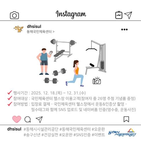 [뉴스노크=김인호 기자] 동해시시설관리공단(이사장 이용빈)은 연말연시를 맞아 시민들의 건강관리 장려하고 헬스장 이용 활성화를 위해 '송구신년 건강실천 오운완 SNS 인증 이벤트'를 개최한다고 밝혔다.