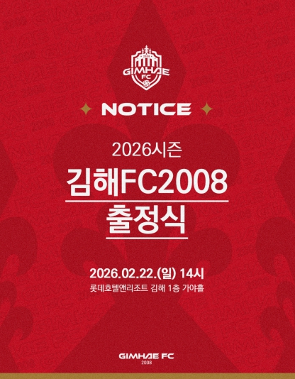 [뉴스노크=김인호 기자] K리그2 무대에 첫 도전장을 내미는 김해FC2008(이하 김해FC)이 오는 22일 오후 2시, 롯데호텔앤리조트 김해에서 ‘2026시즌 출정식’을 개최한다.