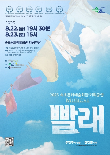 [뉴스노크=김인호 기자] 속초시는 시민과 관광객에게 따뜻한 감동을 전하는 뮤지컬 ‘빨래’를 오는 8월 22일 오후 7시 30분, 23일(토) 오후 3시에 속초문화예술회관 대공연장에서 선보인다.