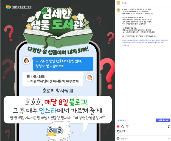 국립호남권생물자원관은 그간의 축적된 섬‧연안 생물자원 조사‧연구 정보를 국민들과 나누고 가치를 확산하고자 누리소통망(SNS)에 ‘섬세한 생물 도서관’ 코너를 신설하고, 국민들이 생물다양성 정보를 보다 쉽게 이해할 수 있도록 카드뉴스 형태로 우리 생물 이야기를 구성했다.
