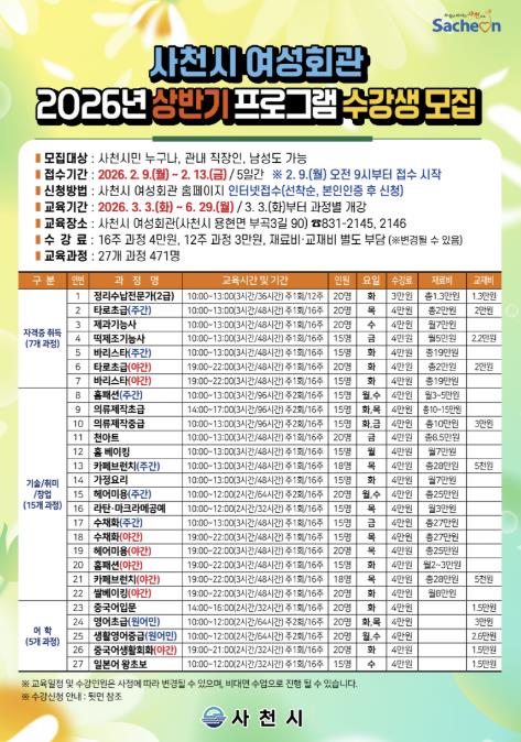 [뉴스노크=김인호 기자] 사천시 여성회관에서는 2026년 상반기 프로그램 수강생을 2월 9일부터 13일까지 사천시 여성회관 홈페이지를 통해 인터넷으로 선착순 모집한다.