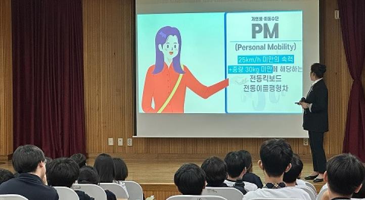 이번 교육은 지난 3일 한국교통안전공단과 체결한 ‘모빌리티 활성화 및 교통안전 증진을 위한 업무협약’의 일환으로 추진됐다. 교육 주요 내용은 개인형 이동장치의 ▲사고 통계 및 사고 영상 ▲정의 및 주행 자격 ▲주정차 제외 구역 안내 ▲이용 안전 수칙 및 처벌 규정 등으로, 참여형 퀴즈를 통해 학생들의 이해도와 흥미를 높였다.