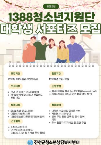 [뉴스노크=김인호 기자] 충북 진천군청소년상담복지센터는 이달 24일부터 대학생 대상 서포터즈 프로그램 ‘2026년 1388청소년지원단 대학생 서포터즈’ 참가자를 모집한다고 밝혔다.