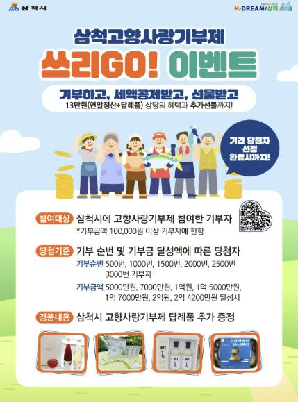 당첨자에게는 삼척시 고향사랑기부제 답례품 중 2~3만 원 상당의 답례품 2종이 경품으로 증정되며, 개별 통보될 예정이다.