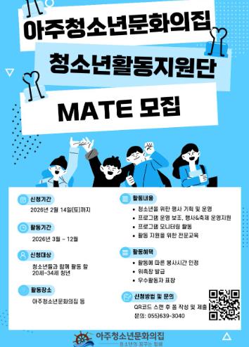 [뉴스노크=김인호 기자] 거제시 아주청소년문화의집은 오는 2월 14일까지 2026년 청소년 활동을 이끌어갈 청소년활동지원단“MATE”단원을 모집한다고 밝혔다.
