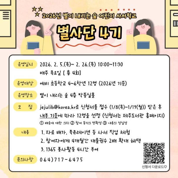 [뉴스노크=김인호 기자] 제주도교육청 제주도서관은 어린이들이 사서 직업을 직접 체험하며 도서관의 역할과 가치를 이해할 수 있도록 2026년 별이 내리는 숲 어린이 사서 학교 ‘별사단 4기’를 운영한다.