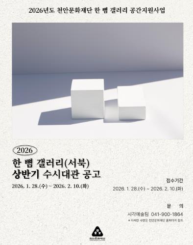 [뉴스노크=김인호 기자] (재)천안문화재단은 오는 28일부터 상반기 한 뼘 갤러리 수시대관 공모 접수를 받는다고 27일 밝혔다.