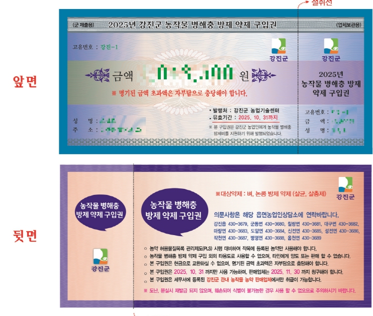 ▲ 2025년도 강진군 병해충 방제 약제 구입권 시안 |
