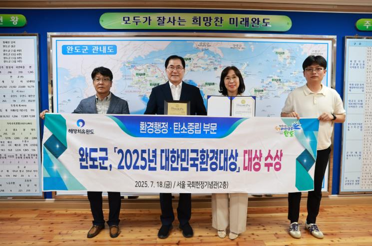 [뉴스노크=김인호 기자] 완도군이 지난 7월 18일 서울 국회 헌정기념관에서 열린‘ 제20회 2025 대한민국 환경 대상’ 시상식에서 환경 행정 탄소중립 분야의 대상을 수상하는 영예를 안았다.