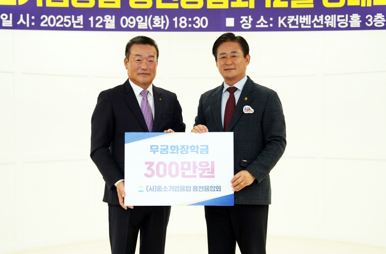 [뉴스노크=김인호 기자] (사)중소기업융합 홍천융합회는 12월 9일 K컨벤션웨딩홀 3층에서 열린 ‘2025년 중소기업융합 홍천융합회 송년회’에서 무궁화장학금 300만 원을 홍천군에 기탁하고, 연탄 3,000장은 (사)이웃에 지정 기탁했다고 밝혔다.
