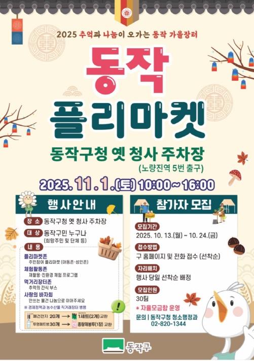 [뉴스노크=김인호 기자] 동작구가 오는 11월 1일 오전 10시부터 오후 5시까지 구청 옛 청사 주차장(노량진역 5번 출구)에서 ‘2025 추억과 나눔이 오가는 동작 가을장터’를 연다고 밝혔다.