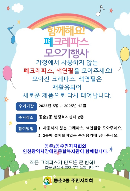 주민들은 동 주민자치센터에 비치된 수거 용기를 통해 쉽게 기증에 참여할 수 있으며, 수거된 크레파스와 색연필은 장애인종합복지관을 통해 새로운 제품으로 재탄생된다.