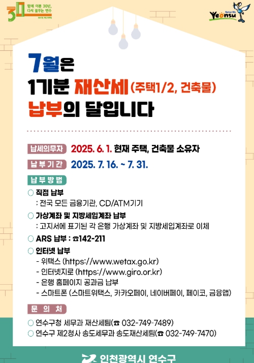 연수구 관계자는 “재산세는 연수구민의 복지와 지역 발전을 위한 소중한 재원으로 활용된다.”라며 “기한이 지나면 납부지연가산세를 추가로 납부해야 하는 불이익이 있으니 납부 기한 내에 납부하여 줄 것”을 당부했다.