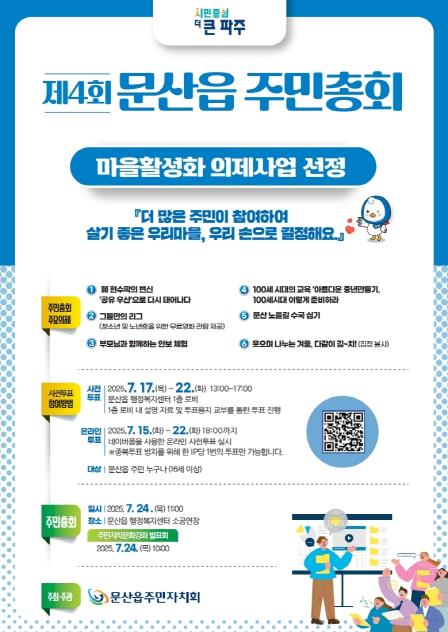 박우영 문산읍 주민자치회장은 “주민총회는 마을의제를 주민과 함께 결정하는 민주적 참여의 장으로, 문산읍의 발전을 위해 주민 한 분 한 분의 목소리가 매우 중요하다”라며 “주민 여러분의 생각을 듣고 함께 고민하는 자리가 될 수 있도록 주민총회에 많은 참석 부탁드린다”라고 밝혔다.