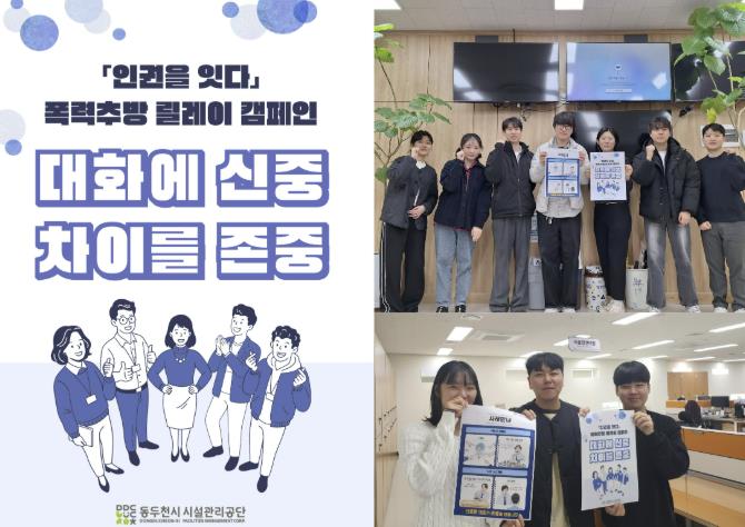 [뉴스노크=김인호 기자] 동두천시시설관리공단은 지난 11일 ‘인권을 잇다’ 폭력추방 릴레이 캠페인에 참여해 직장 내 괴롭힘·성희롱 예방과 인권존중 문화 확산을 위한 다양한 활동을 추진했다고 밝혔다.