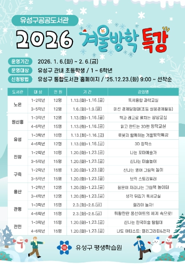 [뉴스노크=김인호 기자] 대전 유성구는 내년 1월 6일부터 2월 6일까지 관내 8개 공공도서관에서 초등학생 대상으로 ‘겨울방학 특강’을 운영한다.
