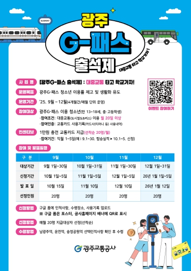 [뉴스노크=김인호 기자] 광주교통공사가 오는 9월부터 12월까지 4개월 동안 지역 청소년을 대상으로 ‘광주G-패스 출석’ 이벤트를 펼친다.