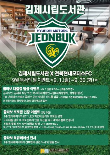 [뉴스노크=김인호 기자] 김제시립도서관은 오는 9월 1일 월요일부터 한 달 동안 전북현대모터스FC와 9월 독서의 달 콜라보 행사를 진행한다고 밝혔다.