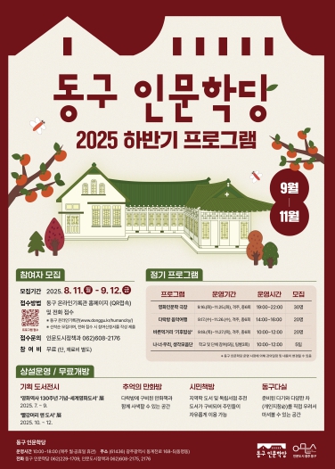 [뉴스노크=김인호 기자] 광주 동구는 오는 9월 12일까지 동구 인문학당의 ‘2025 하반기 프로그램’에 참여할 주민을 모집한다고 밝혔다.