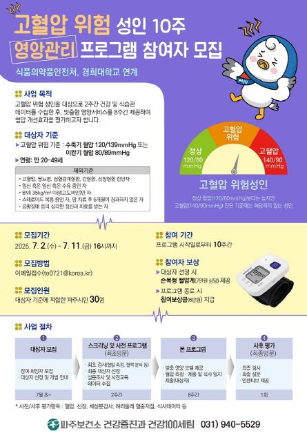 ▲ 파주보건소, 고혈압 위험 성인 10주 영양관리 프로그램 참여자 모집 |