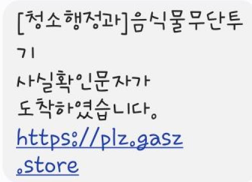 최근 환경부나 파주시를 사칭하여 ‘폐기물관리법 위반 과태료 부과’와 관련된 내용의 문자가 발송됐다고 문의하는 전화가 증가하고 있다. 그러나 파주시에는 ‘청소행정과’라는 부서가 없으며, 폐기물관리법 위반 과태료가 부과될 경우 문자가 아닌 고지서 우편물을 발송하고 있다.