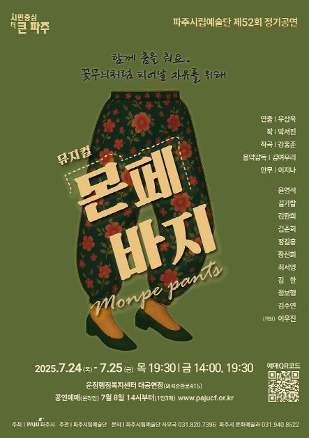 [뉴스노크=김인호 기자] 파주시는 시립예술단 제52회 정기공연으로 광복 80주년을 맞아, 일제강점기를 살아간 소시민들의 저항과 일상을 조명하는 창작 뮤지컬 ‘몬페 바지’를 오는 7월 24일과 25일 총 3회에 걸쳐 운정행복센터 대공연장에서 선보인다.