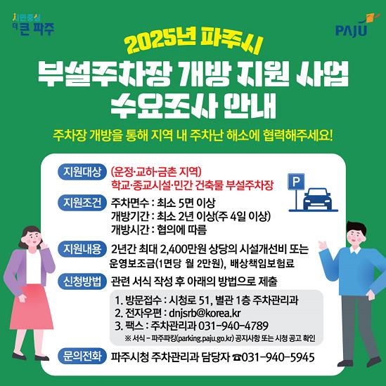 특히 이번 사업은 2025년 5월 7일 개정된 '파주시 주차장 설치 및 관리 조례'를 통해 제도적 근거를 마련하여, 유휴 부설주차장 개방에 대한 법적 기반을 명확히 하고 민간 참여를 장려하기 위한 재정 지원의 근거도 신설됐다. 시는 이를 통해 안정적이고 체계적인 주차 공간 공유 체계를 구축해 나갈 방침이다.