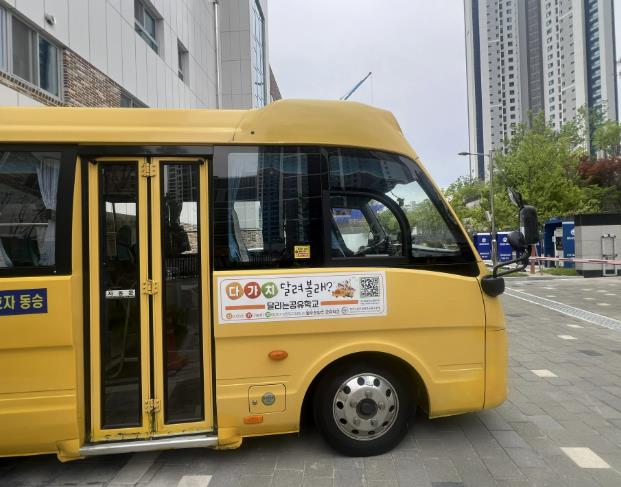 등하교 시간에 운행되는 통학차량에 “다가치 달려볼래? 달리는 공유학교, 동두천양주 다가치 공유학교”문구가 적힌 홍보스티커를 부착하여 공유학교 홍보를 다양화한 것이다.