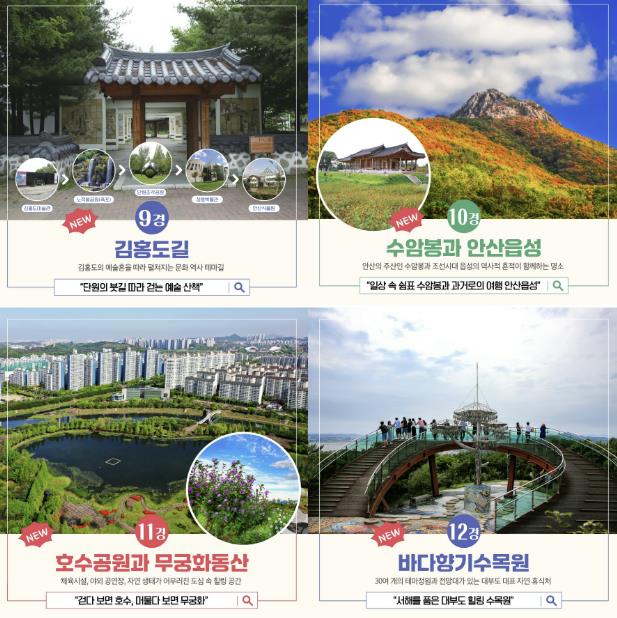 특히, 새롭게 선정된 김홍도길은 김홍도미술관을 시작으로 노적봉공원(폭포), 단원조각공원, 성호박물관, 안산식물원 일대를 연결하며 예술과 자연이 조화를 이루는 안산만의 특별한 관광 코스로 구성했다. 안산 시민이 산책과 조깅을 즐기는 코스로도 유명하다. 수암봉과 안산읍성, 호수공원과 무궁화동산, 바다향기수목원의 경우, 시민 선호와 함께 시의 역사·문화·생태·해양 등 다양한 테마를 아우르는 명소로 평가됐다.