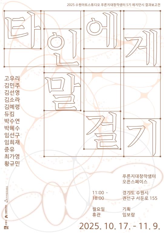 [뉴스노크=김인호 기자] 수원문화재단은 오는 10월 17일부터 11월 9일까지 약 3주간 탑동 시민농장에 자리한 수원아트스튜디오 푸른지대창작샘터에서 5기 레지던시 참여작가 13인의 올 한 해 작품 활동 성과를 공유하는 결과보고전 '타인에게 말 걸기'를 개최한다.