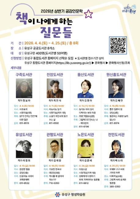 이어 ▲16일 김혜민 작가 ‘질문하는 어른은 늙지 않는다’(원신흥도서관) ▲18일 김재완 작가 ‘역사를 왜 알아야 하는가?’(관평도서관) ▲24일 김혼비 작가 ‘정확하게 다정하기 위해 가져야하는 질문들’(노은도서관) ▲25일 박스타 작가 ‘그림책 속에 숨겨둔 질문들’(전민도서관) 등 8회에 걸쳐 운영된다.
