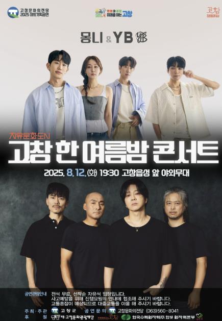 [뉴스노크=김인호 기자] 고창군이 오는 12일 저녁 7시30분 고창읍성 잔디광장에서 YB(윤도현밴드), 몽니를 초청한 ‘고창 한 여름밤 콘서트’를 연다.