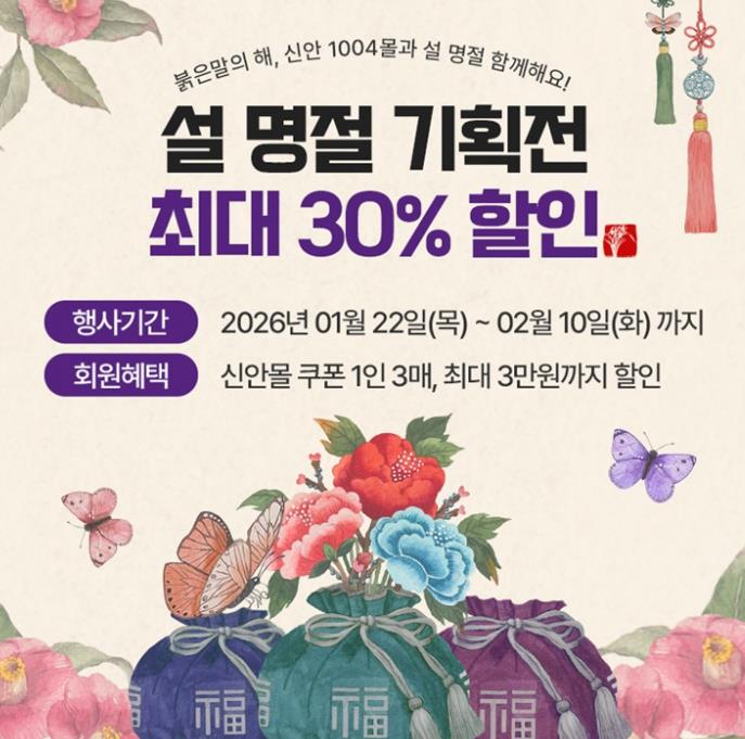 [뉴스노크=김인호 기자] 신안군은 다가오는 설 명절을 맞아 지역 농어가와 소상공인 판로 확대를 위해 온라인 쇼핑몰 ‘신안1004몰)’에서 1월 22일부터 2월 10일까지 설 명절 특별 기획전을 진행한다.