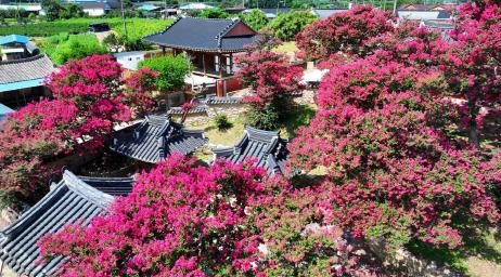 [뉴스노크=김인호 기자] 짙푸른 하늘 아래 붉게 피어난 배롱나무 꽃이 고택의 지붕을 감싸 안는다. 정읍시 태인면 서현사지에 여름이 물들었다.