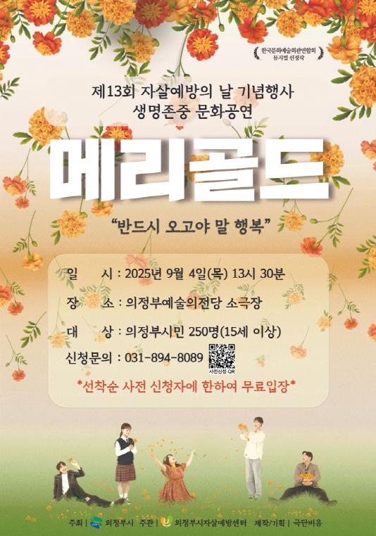 [뉴스노크=김인호 기자] 의정부시자살예방센터는 9월 4일 의정부예술의전당 소극장에서 ‘세계 자살예방의 날’ 기념행사로 창작 뮤지컬 ‘메리골드’를 선보인다.
