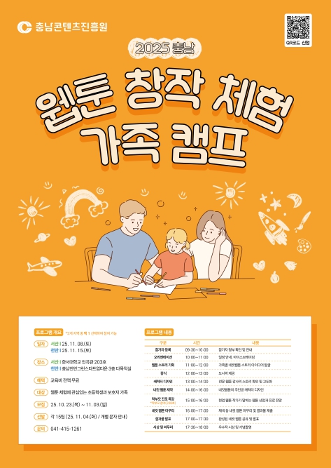[뉴스노크=김인호 기자] 충남콘텐츠진흥원은 충남의 웹툰 문화 활성화와 가족이 함께하는 창의적 웹툰 문화체험을 제공하기 위해 ‘2025 충남 웹툰 창작체험 가족 캠프’를 개최한다.