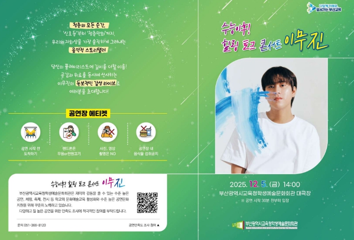 [뉴스노크=김인호 기자] 부산광역시교육청학생예술문화회관(관장 박은혜)은 오는 5일 오후 2시 학생예술문화회관 대극장에서 수능을 마친 고3 학생 700여 명을 대상으로 가수 이무진과 함께하는 ‘수능 이후! 힐링 토크 콘서트’를 개최한다.