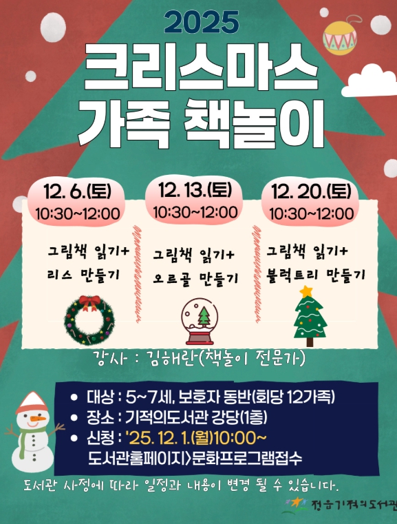 [뉴스노크=김인호 기자] 정읍기적의도서관이 다가오는 성탄절과 연말을 맞아 온 가족이 도서관에서 따뜻한 추억을 쌓을 수 있는 특별한 시간을 마련했다.