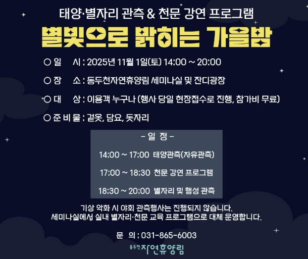 | ▲ 동두천시 시설관리공단, 11월 1일 동두천 자연휴양림에서 ‘별빛으로 밝히는 가을밤’ 개최 |