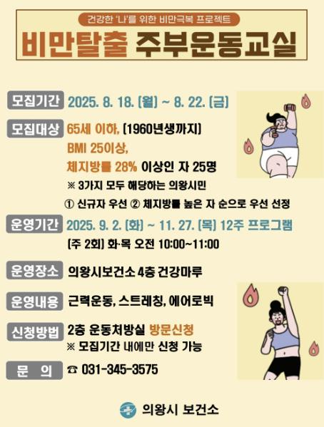 [뉴스노크=김인호 기자] 의왕시 보건소는 오는 8월 18일 부터8월 22일까지 “건강한 ‘나’를 만나는 비만 극복 프로젝트 '비만 탈출 주부 운동 교실'”의 참여자를 모집한다고 밝혔다.